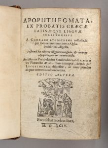 Édition genevoise des Apophthegmes de Conrad Lycosthenes (1518-1561), érudit et humaniste alsacien qui professa entre autres la grammaire et la dialectique.