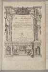 Elle est imprimée sur deux colonnes, le texte grec en regard de la traduction latine. Le titre est placé dans un très joli encadrement gravé sur bois en forme de portique, avec deux cariatides soutenant une grande couronne, la partie basse étant ornée d’une scène avec sept des Muses. Cet encadrement, répété au titre de la seconde partie, provient