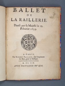 [BENSÉRADE (Isaac de)]. Ballet de la raillerie. Dansé par sa Majesté le 19 Febvrier 1659. Paris, Robert Ballard, 1659. In-4, demi-percaline lie-de-vin (Reliure vers 1900).