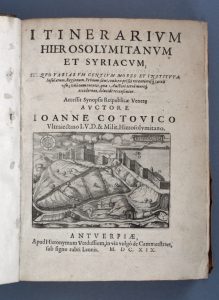 COTOVICUS (Joannes). Itinerarium Hierosolymitanum et Syriacum. Anvers, Jérôme Verdussius, 1619. In-4, vélin à recouvrement, filet doré, cartouche central de forme losangée à motifs de rinceaux autour d’un ombilic, traces d’attaches, dos...