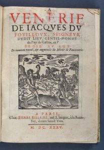 DU FOUILLOUX (Jacques). La Vénerie. De nouveau reveuë, & augmentée du Miroir de Fauconnerie. Paris, Pierre Billaine, 1635. 2 parties en un volume in-4, vélin rigide, titre calligraphié en noir et rouge sur les plats au centre d’un cadre...