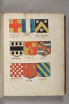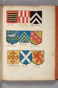 ♦ Armorial composé au XVIIe siècle et renfermant 1398 BLASONS DESSINÉS ET PEINTS AVEC BEAUCOUP DE SOIN, lesquels sont remontés sur des feuillets blancs.