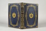 In-folio, maroquin bleu, encadrement d'un triple filet doré avec angles arrondis accueillant des petites armoiries, grand cadre dessiné au moyen d'un triple filet droit et courbe, agrémenté d'écoinçons et de gerbes, armoiries au centre, dos orné, dentelle intérieure, doublure et gardes de moire aubergine, tranches dorées (R. Petit).