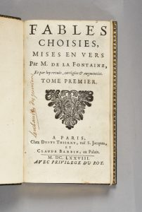 LA FONTAINE (Jean de). Fables choisies, mises en vers. Paris, Denys Thierry et Claude Barbin, 1678-1679 ; [et pour le tome V]: Paris, Claude Barbin, 1694. 5 volumes in-12, maroquin bleu, double filet à froid, armoiries dorées au centre, dos...