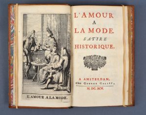 [PRINGY (Jeanne-Michelle de)]. L’Amour de la mode. Satire historique. Amsterdam, George Gallet, 1695. In-12, veau blond, dos orné, pièce de titre rouge, tranches dorées sur marbrure (Reliure de l’époque).