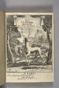 SALNOVE (Robert). La Venerie royale divisee en cinq parties ; qui contiennent les Chasses du Cerf, du Lievre, du Chevreüil, du Sanglier, du Loup, & du Renard. Paris, Antoine de Sommaville, 1665. In-4, maroquin brun, triple filet doré, dos orné,...