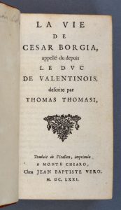 TOMASI (Thomas). La Vie de César Borgia, appelé du depuis [sic] le duc de Valentinois. Monte Chiaro, Jean-Baptiste Vero, 1671. In-12, maroquin rouge, triple filet doré, dos orné, dentelle intérieure, tranches dorées sur marbrure (David).