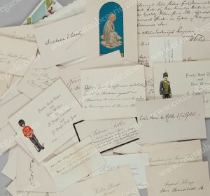 CARTES DE VISITES. Ensemble de 52 cartes de visites et cartes de correspondances manuscrites adressées à la princesse Marie, dont : le Comte Adam de Molthe-Huitfeldt, le comte Christian de Kergolay, le baron Axel Blixen Finecke, la baronne de...