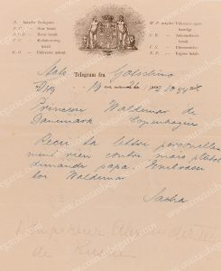 ALEXANDRE III, empereur de Russie (1845-1894). Télégramme signé « Sacha » , adressé à sa belle-sœur, Marie d'Orléans, princesse de Danemark (1865-1909), Gatchina, 26 avril 1892, 1 p., in-folio, sur papier télégramme. Texte en français.