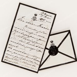 de noir et surmonté du monogramme de l'impératrice sous couronne impériale, conservée avec son enveloppe et cachet en cire noire aux armes de la souveraine. Texte en français.