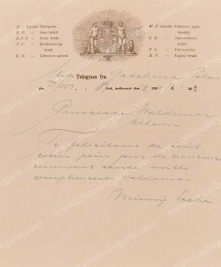 MARIA FEODOROVNA, impératrice de Russie, née princesse Dagmar de Danemark (1847-1928). Télégramme, adressé à sa belle-sœur, Marie d'Orléans, princesse de Danemark (1865-1909), Gatchina, 14 janvier 1889, 1 p., in-folio, sur papier...