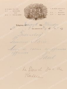 PAUL ALEXANDROVITCH, grand-duc de Russie (1860-1919). Télégramme signé « Paul », adressé à Marie d'Orléans, princesse de Danemark (1865-1909), Illinskoié, 27 septembre 1891, 1 p., in-folio, sur papier télégramme. Texte en français.
