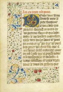 ► Fragment d'un manuscrit du XVe siècle sur peau de vélin, rubriqué, orné de 23 initiales peintes à l'or liquide et de bordures de rinceaux fleuris couvrant deux pages.
