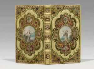 ► Ravissante reliure mosaïquée, décorée de deux scènes peintes.