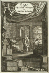 ♦ Très beau frontispice gravé en taille-douce représentant l'intérieur d'un bureau de change et de comptabilité d'un entrepôt maritime.