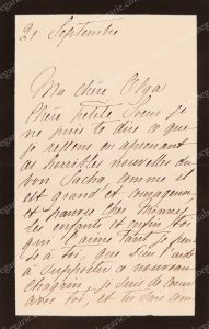 MARIE, princesse de Danemark, née princesse d'Orléans (1865-1909). L.A.S. : « Marie », adressée à sa belle-sœur, la reine Olga de Grèce, née grande-duchesse de Russie (1851 -1920), 21 septembre (1894), 3 p., in-8, sur papier bordé de noir....