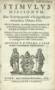 [THOMAS DE JÉSUS]. Stimulus missionum; Sive de propaganda a Religiosis per universum Orbem Fide. Rome, Jacob Mascardum, 1610. In-8, vélin souple, titre à l'encre au dos (Reliure de l'époque).