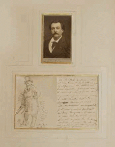 La photographie est montée au-dessus d'une lettre autographe signée adressée à la même Andrea, comportant un joli autoportrait à la plume le montrant coiffé d'un haut de forme et légendé: Gustave Doré Esqre London.