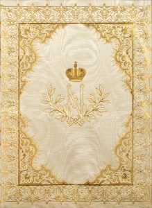 NICOLAS II, empereur de Russie. Couverture d'une reliure en taffetas de soie moirée couleur champagne, frappée au centre en lettres d'or du monogramme de l'empereur Nicolas II sous couronne impériale, encadré d'une frise stylisé dorée,...
