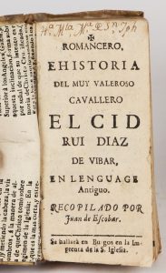 [CID (Le)]. Romancero, e historia del muy valeroso cavallero el Cid Rui Diaz de Vibar, en lenguage antiguo. Recopilado por Juan de Escobar. En Burgos en la Imprenta de la S. Iglesia, s. d. [circa 1700 ?]. Petit in-12 étroit (67 x 140 mm), vélin...