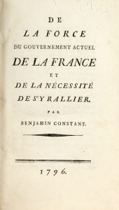 CONSTANT (Benjamin). • De la force du gouvernement actuel de la France et de la nécessité de s'y rallier. S. l., 1796. • Des réactions politiques. S. l., an V [1796/1797]. 2 ouvrages en un volume in-8°, demi-basane marbrée, dos lisse...
