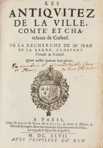 [CORBEIL]. La BARRE (Jean de). Les Antiquitez de la Ville, Comté et Chatelenie de Corbeil [...]. À Paris, Chez Nicolas & Jean de la Coste, 1647. Petit in-4°, vélin ivoire souple de l'époque.