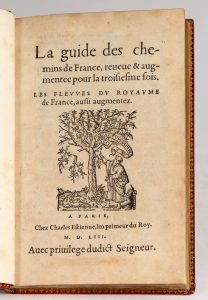 [ESTIENNE (Charles)]. La Guide des chemins de France, reueue & augmentee pour la troisiesme fois. Les Flevves dv Royavme de France, aussi augmentez. À Paris, Chez Charles Estienne, Imprimeur du Roy, 1553. Petit in-12, maroquin rouge janséniste,...