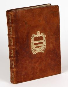 Petit in-4°, basane, armoiries dorées au centre des plats, dos à nerfs orné, les entrenerfs portant une alternance de lettres « c » et « h » (reliure de l'époque).