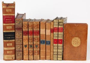 Réunion de cinq titres en un volume in-8°, veau blond, armoiries dorées au centre des plats, dos à nerfs orné de pièces d'armes dorées alternées (reliure de l'époque).