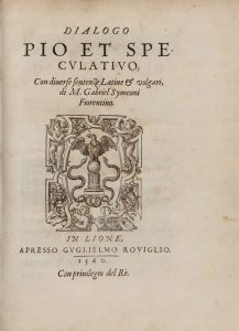 SYMEONI (Gabriel). Dialogo pio et specvlativo, con diuerse sentenze latine & volgari […]. In Lione, Apresso Gvglielmo Roviglio [À Lyon, Chez Guillaume Rouille], 1560. Petit in-4° (160 x 217 mm), vélin ivoire souple à petits recouvrements,...