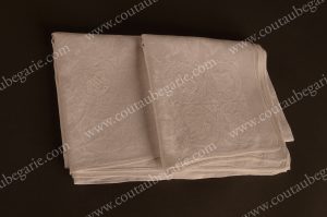 coton à décor damassé brodé d'un monogramme F.O. Bon état. Travail étranger du XIXe siècle. Provenance : ancienne collection du prince Carl de Suède (1858-1950) et par sa fille la princesse Margaretha de Suède, épouse du prince Axel de Danemark (1888-1964).