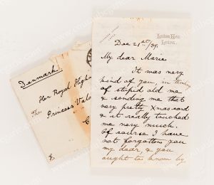 GEORGE V, roi de Grande-Bretagne (1865-1936). L.A.S. « Georgie », adressée à Marie d'Orléans, princesse de Danemark (1865-1909), Luton Hoo, 21 décembre 1889, 3 p., in-8, conservée avec son enveloppe. Texte en anglais.
