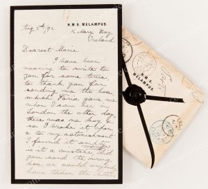 GEORGE V, roi de Grande-Bretagne (1865-1936). L.A.S. « Georgie », adressée à Marie d'Orléans, princesse de Danemark (1865-1909), H.M.S. Melampus, 3 août 1892, 4 p., in-8, sur papier bordé de noir, conservée avec son enveloppe. Texte en anglais.
