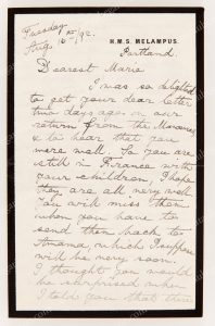 GEORGE V, roi de Grande-Bretagne (1865-1936). L.A.S. « Georgie », adressée à Marie d'Orléans, princesse de Danemark (1865-1909), H.M.S. Melampus, 16 août 1892, 4 p., in-8, sur papier bordé de noir, texte en anglais.