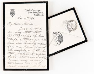 GEORGE V, roi de Grande-Bretagne (1865-1936). L.A.S. « Georgie », adressée à Marie d'Orléans, princesse de Danemark (1865-1909), York Cottage, Sandringham, 12 novembre 1898, 3 p., in-8, sur papier bordé de noir et à en-tête imprimé de sa...
