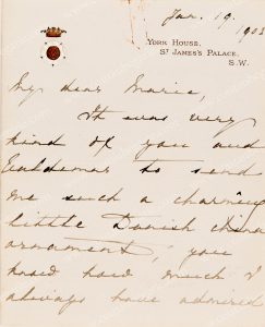MARY, reine de Grande-Bretagne (1867-1953). L.A.S. « May », adressée à Marie d'Orléans, princesse de Danemark (1865-1909), York House, 19 juin 1902, 4 p., in-8, sur papier à en-tête imprimé de sa résidence et de son monogramme sous couronne....