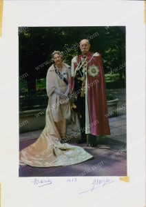 avec leurs signatures autographes au bas du document : « Marie, Georges, 1953 ». On y joint une photographie du prince Georges et une photographie de la princesse Eugénie (1910-1989). Epreuve d'époque argentique et couleur. H.: 30 cm - : L.: 23 cm, H. 17 cm - : L. : 20 cm, H.: 30 cm - : L. : 24 cm. Remis en vente sous folle enchère.