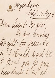 ALICE, princesse de Grèce (1885-1969). L.A.S.: « Alice », adressée à sa tante, Marie d'Orléans, princesse de Danemark (1865-1909), Jugenheim, 16 septembre 1905, 4 p., in-8, sur papier à en-tête de son monogramme sous couronne royale. Texte en...