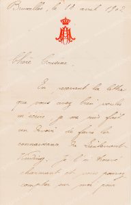 ALBERT Ier, roi des Belges (1875-1934). L.A.S. : «Albert», adressée à sa cousine, Marie d'Orléans, princesse de Danemark (1865-1909), Bruxelles, 18 avril 1902, 2 p., in-8, à en-tête de son monogramme sous couronne royale. Texte en français.