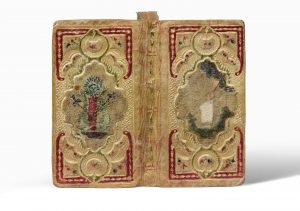 Calendrier de la Cour, tiré des éphémérides, pour l'année 1782. Imprimé pour la famille royale, et Maison de Sa Majesté. Paris, Veuve Hérissant, 1782. In-24, maroquin blanc, décor à la plaque dorée rehaussé de peinture de couleurs, miniatures différentes peintes dans la réserve centrale de chaque plat, dos lisse orné, doublures et gardes en papier à motifs vert et doré, tranches dorées, étui de maroquin rouge orné de roulettes et fleurons dorés (Reliure de l'époque). Charmante reliure en maroquin blanc au décor doré et peint. Petits accrocs à l'étui, qui a probablement été confectionné pour un autre almanach. Grand-Carteret, n°92 – Saffroy : Almanachs, n°204.