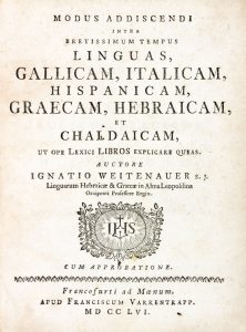 La Réunion des langues, ou l'art de les apprendre toutes par une seule. Paris, Sébastien Mabre-Cramoisy, 1674. – [Relié en tête :] WEITENAUER (Ignaz). Modus ad discendi intra brevissimum tempus linguas, gallicam, italicam, hispanicam, græcam, hebraicam, et chaldaicam. Francfort-sur-le-Main, Franz Varrentrapp, 1756. 2 ouvrages en un volume in-4, basane marbrée, dos orné, tranches mouchetées (Reliure de l'époque). Éditions originales de ces deux ouvrages d’une grande rareté sur la linguistique et l'apprentissage des langues. Mathématicien, linguiste et missionnaire jésuite, Pierre Besnier (1648-1705) était célèbre pour son érudition et sa connaissance des langues étrangères. « Dans le cadre général de l’historiographie linguistique, la contribution de Besnier est loin d’être négligeable : participation aux discussions concernant la création d’une langue universelle (Descartes, Delgarno, Wilkins, Leibniz), préfiguration des grammaires générales du XVIIIe siècle (Condillac, Harris), recherches sur le symbolisme linguistique (en particulier la métaphore) dans l’histoire des langues (Vico), étude des rapports entre la langue et le « génie » du peuple (Von Humboldt) » (M. Trousson). Dans l'ouvrage relié en tête du volume, le jésuite bavarois Ignaz Weitenauer (1709-1783) prétend enseigner en une seule journée l'usage du français, de l’italien, de l’espagnol, du grec, de l’hébreu et du chaldéen. Reliure usagée avec manques, piqûre de ver marginale, déchirure angulaire avec manque infime au titre de La Réunion des langues, quelques rousseurs. Sommervogel, I, 1410 et VIII, 1052 – M. Trousson, RBPH, n°65-3, 1987, pp. 640-641.