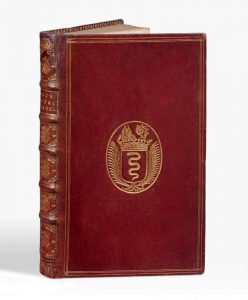 Petri Castellani magni Franciæ Eleemosynarii vita. Paris, François Muguet, 1674. In-8, maroquin rouge, triple filet doré, armoiries au centre, dos orné d'un chiffre répété, dentelle intérieure dorée, tranches dorées (Reliure de l'époque). Édition originale. Cette biographie de l'humaniste Pierre Duchâtel (1480-1522), évêque d'Orléans et garde de la bibliothèque du roi, composée par Pierre Galland, a été publiée par le célèbre érudit et bibliophile Étienne Baluze, qui fut le bibliothécaire de Colbert puis de ses fils. Baluze ajouta ses propres commentaires à ce texte important pour l'histoire de la renaissance des lettres sous le règne de François Ier. La vie de Duchâtel est suivie, dans l'édition, de deux ouvrages : Le Trespas, obseques & enterrement du roy François, premier de ce nom, et Le Premier [puis Le Second] sermon funebre faict et prononcé ès obseques et enterrement du feu roy tres chrestien François. Bel exemplaire en maroquin rouge aux armes et au chiffre de Jacques-Nicolas Colbert (1655-1707). Second fils du ministre de Louis XIV, il fut abbé de l'abbaye du Bec dans le diocèse de Rouen, membre de l'Académie française et l'un des fondateurs de l'Académie des inscriptions et belles-lettres. En 1690, ce collectionneur avait joint à sa propre bibliothèque, conservée à Rouen, celle de son frère aîné, le marquis de Seignelay, héritée du grand Colbert. Restauration à la coiffe de tête. Hauser, n°1245 – OHR, 1298, nos 1 et 6 – Denise Bloch, « La bibliothèque de Colbert », HBF, II, 165.