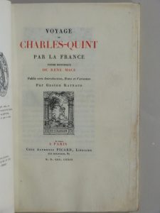Voyage de Charles-Quint par la France. Paris, Alphonse Picard, 1879. In-8, broché, couverture de papier marbré, non rogné, boîte en box grainé rouge garnie de daim grenat, étui bordé assorti (Leroux). Édition originale, publiée d'après les manuscrits de l'époque avec introduction, notes et variantes par Gaston Raynaud. C'est à la demande de François Ier que René Macé, son historiographe, composa cette chronique rimée du voyage en France entrepris par Charles-Quint de novembre 1539 à janvier 1540. Ce poème a le mérite de fournir « quelques aperçus sur la société et la cour de François Ier, mais il nous permet encore... d'étudier la manière dont au XVIe siècle les poètes patentés et consacrés grands hommes par leurs contemporains composaient et écrivaient les œuvres qui leur ont valu une réputation... », écrit son éditeur moderne (p. xx). Un des 2 exemplaires de tête sur peau de vélin d'Augsbourg, broché, conservé dans un élégant étui-boîte signé de Georges Leroux. Légères salissures sur les témoins conservés.