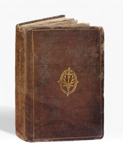 L'Œconomie spirituelle et temporelle de la vie, et maison, noblesse, & religion des nobles & des grands du monde, dressée sur la vie, pieté et sage œconomie de Louyse de Lorraine. Paris, Eustache Foucault, 1619. In-4, maroquin fauve, double filet doré en encadrement, armoiries au centre, dos lisse titré en long dans un même encadrement, tranches lisses (Reliure de l'époque). Édition originale rare. Cet ouvrage de l'abbé Malet, qui était chancelier du duché de Mercœur, constitue incidemment l'une des premières biographies de Louise de Lorraine, l'épouse du roi Henri III, dont un beau portrait hors texte, gravé en taille-douce par Thomas de Leu, orne le volume. Les pièces liminaires contiennent une Ode sur L'Œconomie du Sieur Malet signée A.M. S.D.B. qui ne se trouve pas dans tous les exemplaires. Exemplaire en maroquin fauve aux armes de Pierre Nivelle, abbé de Cîteaux, provenance rare. Issu d'une famille de marchands établis à Troyes, Pierre Nivelle (1593?-1661) fut abbé de Saint-Sulpice, puis abbé général de l'ordre cistercien de 1625 à 1635, et enfin évêque de Luçon de 1635 à sa mort. Inscriptions anciennes sur les premières gardes, dont cet ex-libris : à monsieur Nivel le conseillé. Manques sur les coupes, des épidermures sur les plats, des cahiers légèrement déréglés, infime travail de ver marginal dans le fond du volume. Lelong, n°25127.