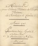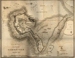 Mémoires pour l'histoire militaire de l'Europe pendant la Révolution de France : année 1795. Expédition des Anglais sur les Isles de Noirmoutier et Dieu. Mai 1796. S.l.n.d. Manuscrit de la fin du XVIIIe ou du début du XIXe siècle. Titre calligraphié et 183 pp. copiés d'une écriture lisible et sans ratures. In-4, bradel cartonnage de papier bleu (Reliure de l'époque). Précieuse relation manuscrite de l'expédition de l'île d'Yeu (août-novembre 1795), menée par le comte d'Artois durant la deuxième guerre de Vendée. Cet ouvrage anonyme semble inédit. Contenu : Description de l'Isle de Noirmoutier (pp. 2-22), Description de l'Isle Dieu (pp. 23-33), Expédition de Noirmoutier (pp. 33-121), Expédition de l'Isle Dieu (pp. 122-169), Pièces justificatives (pp. 170-183). On a relié en fin de volume deux cartes repliées, de Noirmoutier en septembre 1795 et de l'Île-d'Yeu en octobre 1795, gravées par T. Foot. Cachet sec : Parsons Bristol.