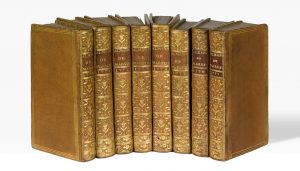 Almanach historique de Marseille. Marseille, Jean Mossy, 1770-1777. 8 volumes in-24, veau blond, triple filet doré, dos lisse orné, dentelle intérieure dorée, tranches dorées (Reliure de l'époque). Tête de collection du premier almanach marseillais, rédigé par l'antiquaire Jean-Baptiste Grosson. L'année 1771 comprend une vue de la façade de l'hôtel de ville de Marseille gravée par le peintre et architecte marseillais Jean-Joseph Kapeller repliée en frontispice. L'Almanach historique de Marseille a paru de 1770 à 1790 et, au complet, réunit 21 volumes. Une note du premier propriétaire de l'exemplaire, jointe sur un feuillet volant, apporte toutefois cette précision : Les premiers Almanachs de Marseille pouvant former une collection intéressante par les anecdotes que M. Grosson y a insérées sur l'histoire et les établissements de cette ville, je les ay faits relier jusqu'à l'année 1777 – époque après laquelle il a cessé de les rédiger. Exemplaire de choix dans une ravissante reliure en veau blond de l'époque. Excellente condition. Un plat légèrement décoloré. Saffroy : Almanachs, n°486.