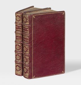 Les Provinciales ou les lettres écrites de par Louis de Montalte, à un provincial de ses amis, et aux RR. PP. Jésuites. Cologne, Nicolas Schoute, 1669. 2 volumes petit in-12, maroquin rouge, filet doré avec petits fleurons aux angles, dos orné, coupes décorées, dentelle intérieure dorée, tranches dorées sur marbrure (Reliure de l'époque). Contrefaçon en 501 pp. de la septième édition, la quatrième donnée par les Elzevier d'Amsterdam, elle-même réimprimée ligne pour ligne sur la sixième édition. On y a joint la Lettre d'un avocat du Parlement à un de ses amis, que l'on attribue à Antoine Le Maître. Très bel exemplaire établi pour un amateur raffiné de l'époque, divisé en deux minces volumes et relié en maroquin décoré, condition rare et des plus recherchées pour les éditions anciennes de Pascal. Maire, II, 204 – Willems, n°1419 (éd. en 476 pp.).