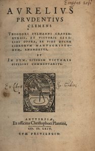 [Opera]. Theodori Pulmanni Cranenburgii, et Victoris Giselini opera, ex fide decem librorum manuscriptorum, emendatus, et in eum, ejusdem Victoris Giselini commentarius. Anvers, Christophe Plantin, 1564. 2 parties en un volume in-8, veau fauve, filet doré, médaillon ovale à fond azuré au centre, dos orné de fleurons dorés, tranches lisses (Reliure de l'époque). Première et seule édition des œuvres de Prudence imprimée par Plantin, établie par Theodor Poelmann et Victor Giselinus, dont l'important commentaire occupe la seconde partie du volume. Exemplaire en jolie reliure de l'époque provenant probablement de la bibliothèque de Jean Bodin (1529-1596), l'auteur des Six Livres de la République et de la Démonomanie des sorciers, avec ex-libris manuscrit au titre : Ex libris Jo. Bodini, et sur la dernière garde : Ex libris Joannis Bodini. Légers manques aux coins et à la coiffe de queue, quelques piqûres de ver et petites mouillures sans gravité dans les marges. Voet, nos 2113 et 1250 – Adams, P-2186.