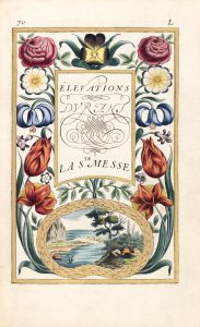 Heures nouvelles tirées de la Sainte Ecriture. Paris, chez l'auteur, Claude de Hansy, s.d. In-8, maroquin violet, dentelle dorée et à froid en encadrement, importante plaque dorée et mosaïquée de maroquin vert, rouge et jaune, dos orné de même, large dentelle intérieure dorée, tranches dorées, boîte en maroquin rouge décoré (Reliure du XIXe siècle). Célèbre livre d'heures gravé, considéré comme un chef-d'œuvre des arts décoratifs et l'un des sommets du livre orné français. Le maître d'écriture Louis Senault en dessina et grava au burin le texte et les ornements décorant chaque page : guirlandes de fleurs, calligraphies au trait de plume, lettres ornées, etc. Ces Heures nouvelles connurent un vif succès et furent continuellement réimprimées. Le présent exemplaire provient d'un second tirage, reconnaissable aux fleurons couvrant la poitrine des sirènes, p. 210. Précieux exemplaire en coloris d'époque dans une très belle reliure mosaïquée romantique, superbe écho des illustrations du texte. Les ornements (environ 125), titres, en-têtes, lettres ornées, culs-de-lampe ont été soigneusement miniaturés à la fin du XVIIe siècle, en couleurs vives et rehauts d'or. Le coloris très soigné donne parfois l'aspect de petits tableaux charmants. Quelques ornements, vers la fin du volume, n'ont pas été coloriés. De la bibliothèque Armand Ripault (1924, I, n°7), avec ex-libris. Bonacini, n°1689 – Jammes : Belles écritures, n°40 – Brunet, III, 148.