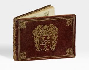 Airs à boire à trois parties, avec la basse-continuë. Paris, Robert Ballard, 1666. Petit in-8 oblong, maroquin rouge, triple filet doré, fleuron aux angles, armoiries au centre, dos orné, coupes décorées, dentelle intérieure dorée, tranches dorées (Reliure de l'époque). Édition originale rarissime de ce recueil de chansons bachiques imprimées avec la musique notée. Le volume est orné d'un remarquable encadrement de titre et de jolies lettrines, le tout gravé sur bois. Compositeur baroque, Jean Sicard est l’auteur de quelque 336 airs sérieux et à boire réunis en dix-sept recueils publiés de 1666 à 1683 par Robert Ballard. Il s’attira de grands éloges de la part de Titon du Tillet et de Pierre de Nyert, chanteur à la cour dont on connaît l’influence sur le chant français. Précieux exemplaire de dédicace dans une fine reliure en maroquin rouge aux armes de Bruneau de Neufville, conseiller du roi et auditeur en sa chambre des comptes. Incomplet de deux feuillets (ff. 8 et 9).